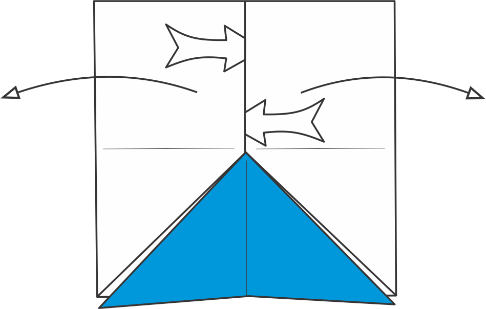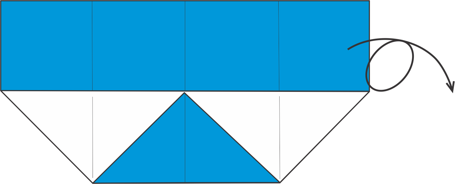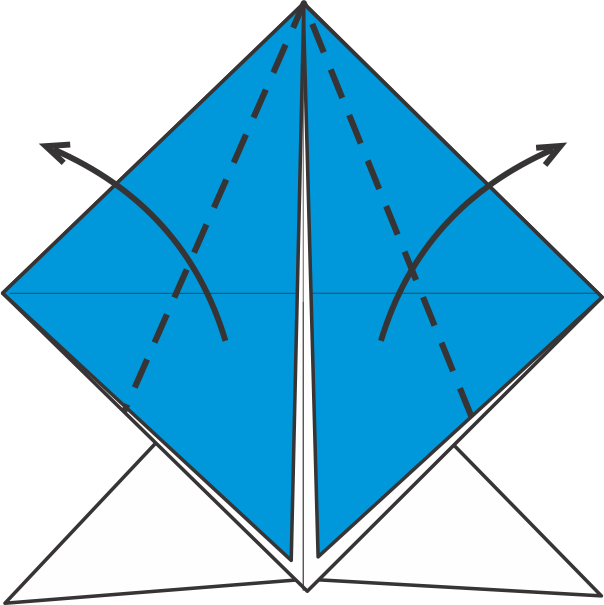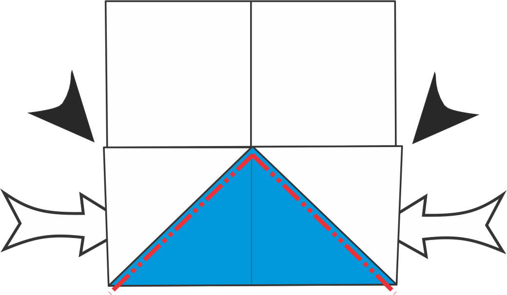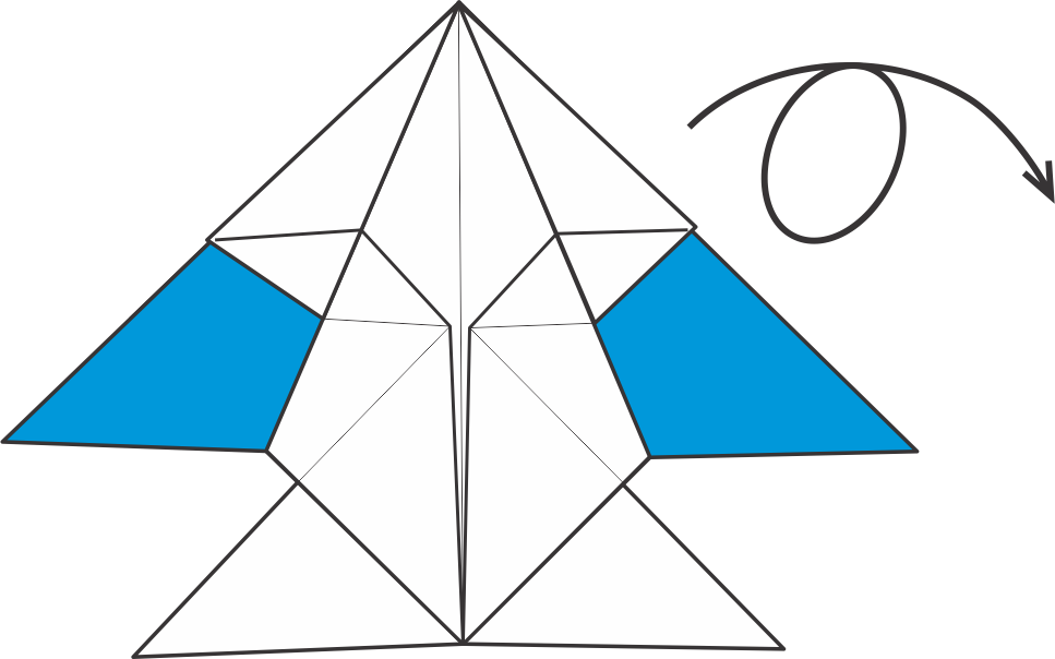 Dobla hacia afuera los triángulos azules de la parte superior siguiendo las diagonales — estas serán las aletas pectorales.