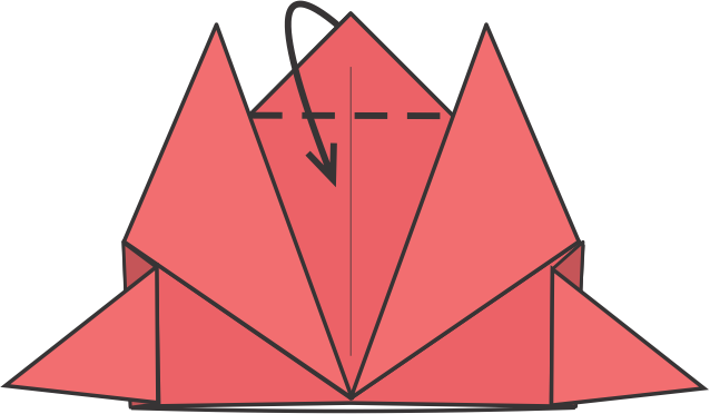Toma la capa frontal del triángulo y dobla ambas esquinas inferiores hacia arriba según las líneas punteadas. Las puntas deben quedar apuntando hacia arriba pero sin tocar la parte superior.