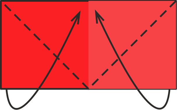 Toma la esquina inferior izquierda y dóblala en diagonal para que la punta llegue a la parte superior sobre la línea central. Repite con la esquina inferior derecha. Aquí comienza a formarse el corazón.