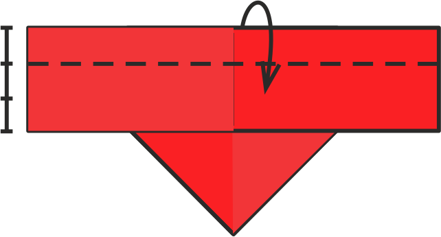 Toma el borde horizontal superior y dóblalo hacia abajo siguiendo la línea punteada, cubriendo parte de la forma central. Este pliegue define la parte alta del corazón y la base de las alas.